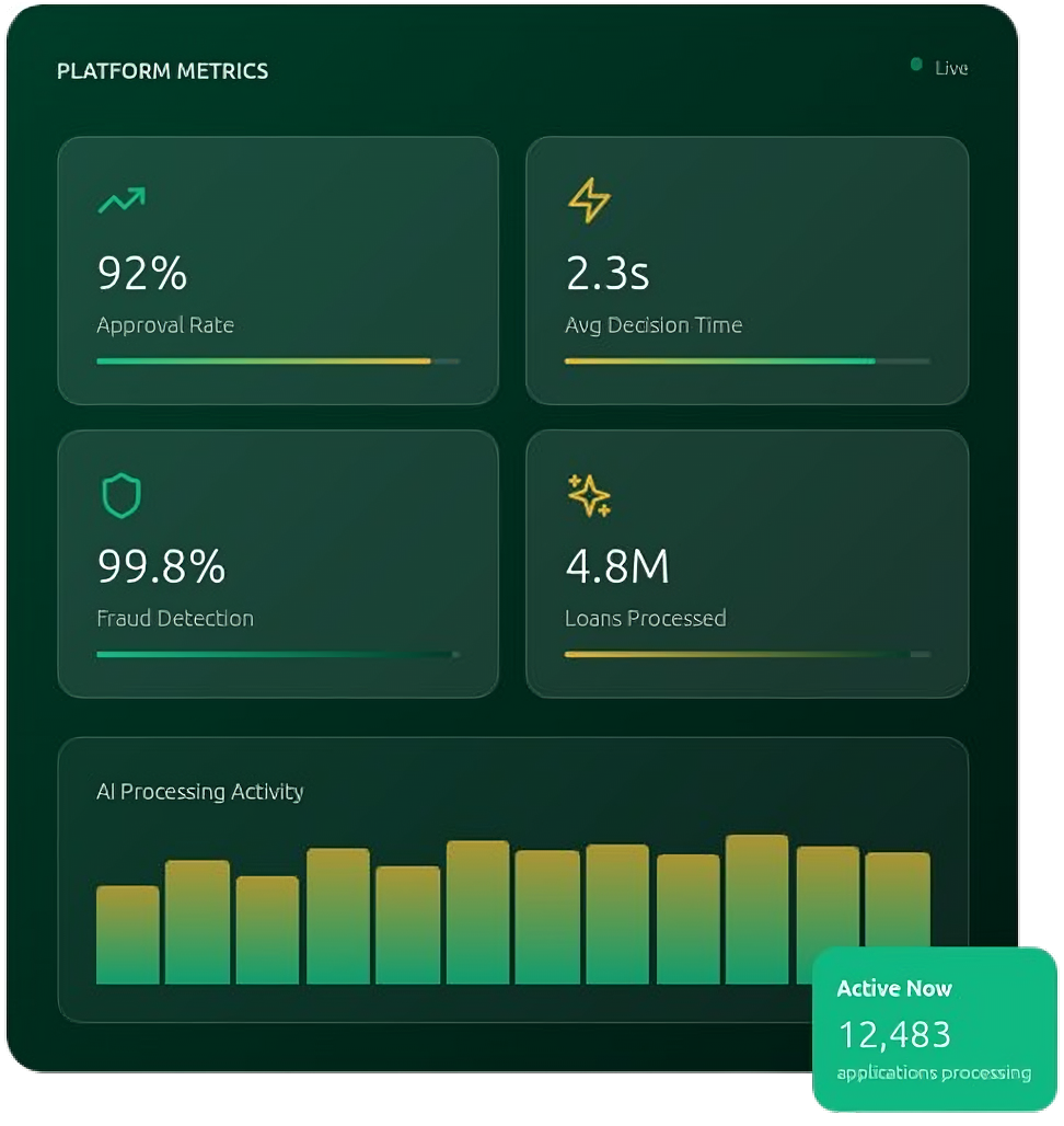 AI revolutionizing credit decisioning, risk assessment, and fraud detection with instant, accurate lending decisions.